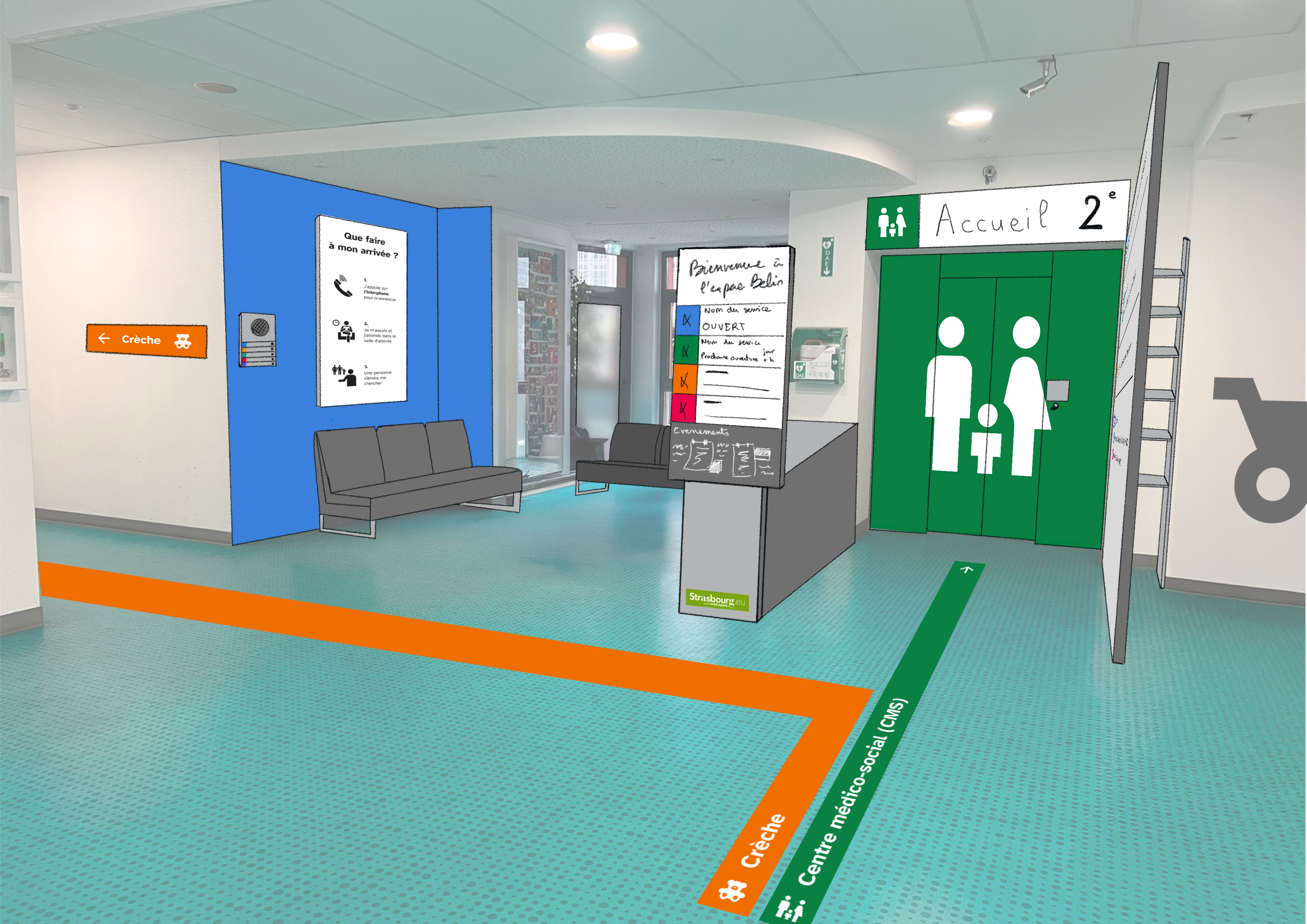 Suite à une première mission d'évaluation de l'expérience d'accueil, les agents des différents services ont alors été engagé dans une démarche de co-construction pour imaginer une signalétique inclusive, en utilisant la méthodologie FALC (Facile à Lire et à Comprendre) pour garantir une meilleure compréhension et orientation dans le lieu.